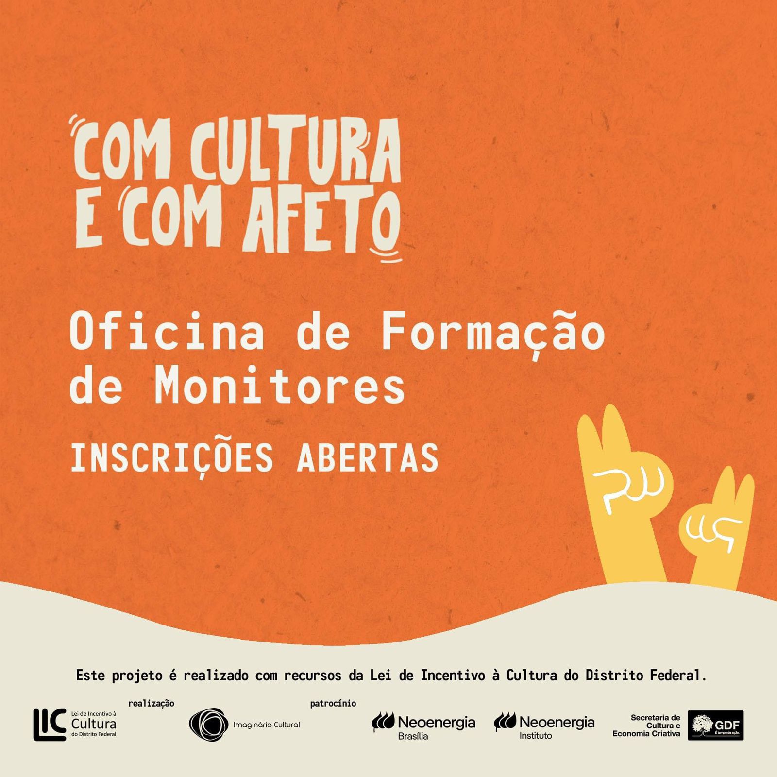 A Associação Imaginário Cultural anuncia a abertura das inscrições para a Oficina gratuita de Formação de Monitores do Projeto Com Cultura e Com Afeto, direcionada a jovens com idades entre 18 e 25 anos do Distrito Federal. Um total de 20 vagas estão disponíveis para esta iniciativa, que é viabilizada através dos recursos da Lei de Incentivo à Cultura do Distrito Federal, sob a gestão da Secretaria de Cultura e Economia Criativa local.