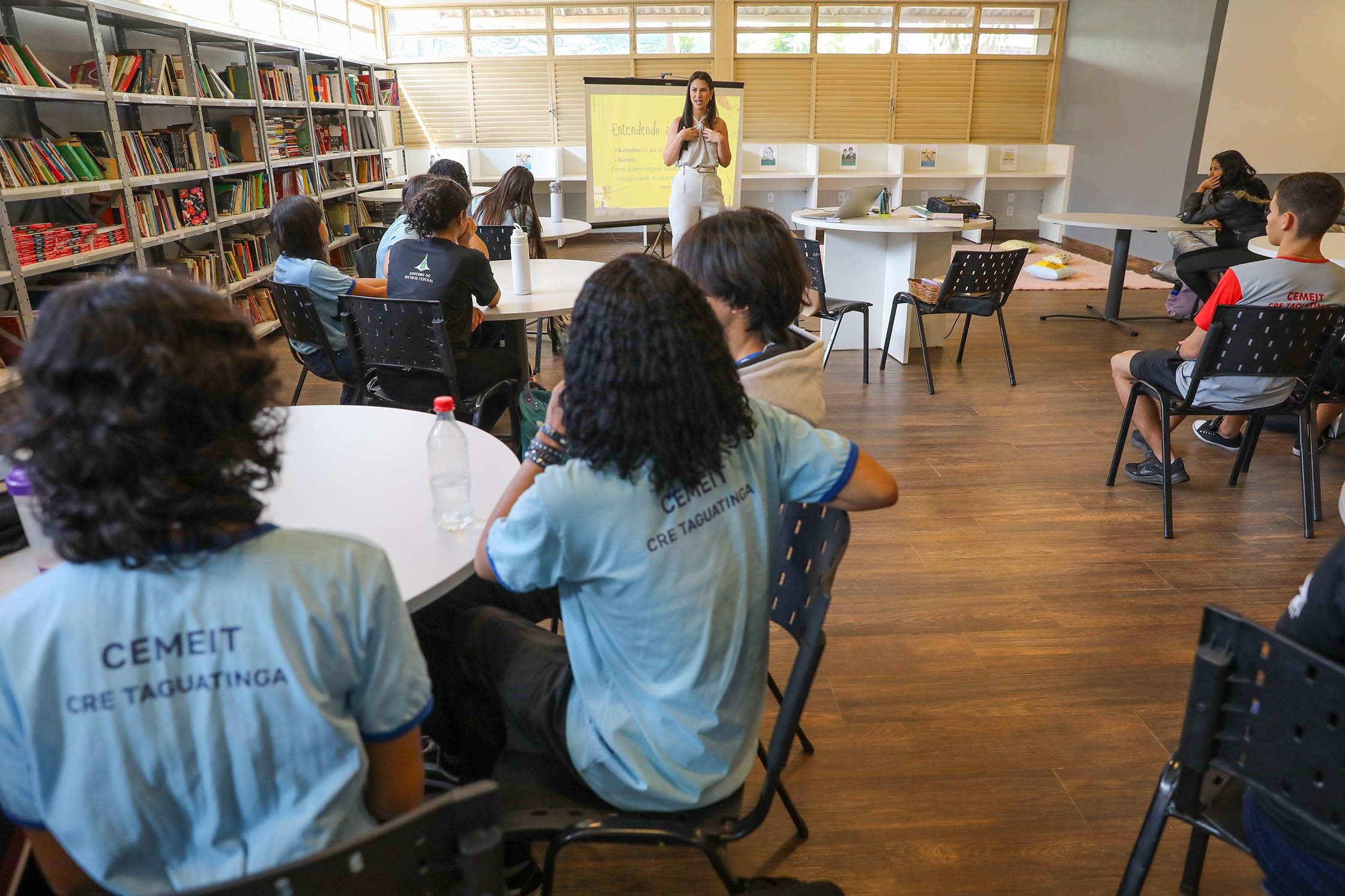 A psicóloga Beatriz Reis, uma das voluntárias, esteve na escola nesta quarta-feira (30) para conduzir uma palestra sobre autoestima, ansiedade e a relação emocional com a comida. “Mostramos que autoestima é ação. Quando o jovem começa a praticar isso no cotidiano, ele entende que pode lidar com as emoções de outras formas, sem recorrer à comida como alívio”, explica.