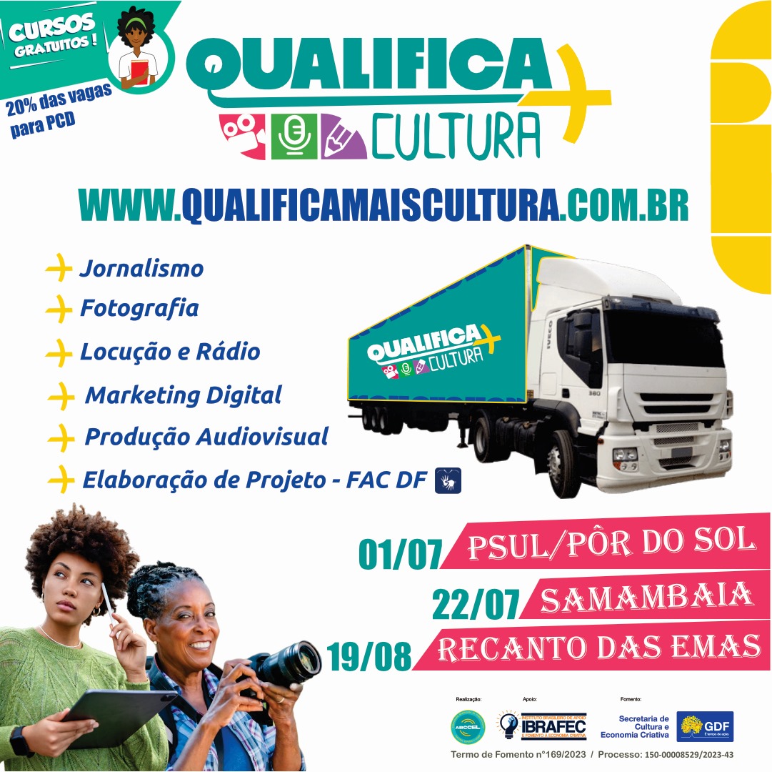 A 1° etapa inicia dia 1º de julho, na QNP 36 PSUL/Pôr do Sol (Praça da Cruz), em frente ao BISTECÃO. Os cursos têm duração de 18 horas/aula, com certificado ao final, e serão oferecidos gratuitamente nas áreas de: Jornalismo, Fotografia, Produção Audiovisual, Locução e Rádio, Marketing Digital, e Elaboração de Projeto – FAC DF com acessibilidade em Libras.
