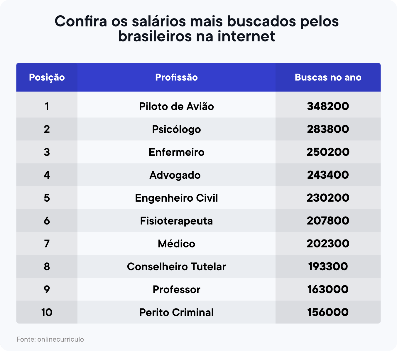 Abaixo, é possível conferir o ranking das dez profissões com salários mais procurados e o volume de buscas na internet: