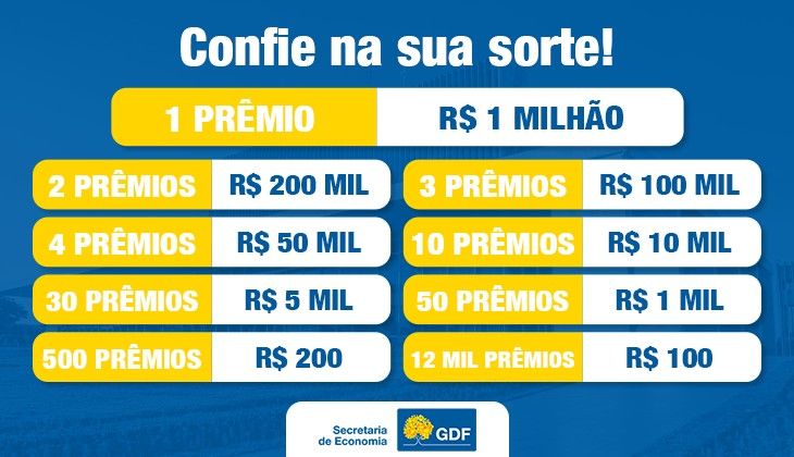 O total sorteado será de R$ 3,5 milhões, com dois prêmios de R$ 200 mil; três de R$ 100 mil; quatro de R$ 50 mil; dez de R$ 10 mil; 30 de R$ 5 mil, 50 de R$ 1 mil, 500 de R$ 200 e 12 mil de R$ 100. Todos pagos integralmente, já com os impostos descontados. Acompanhe e torça ao vivo, a partir das 15h, pelos canais digitais da @seecdf.
