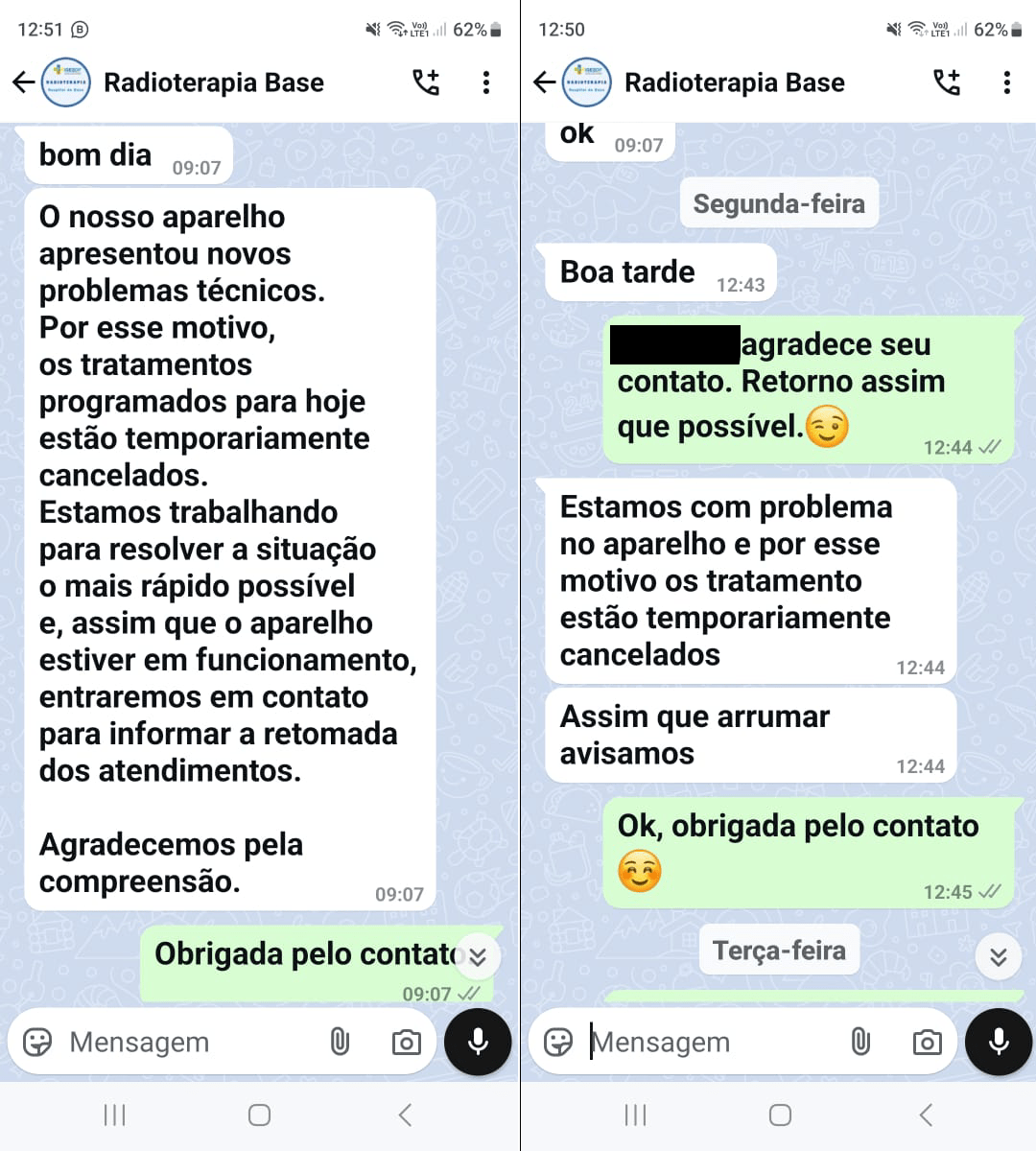 Fróes chamou atenção ainda, à forma como os posicionamentos são dados, aos pacientes de radioterapia, por parte do atendimento do HBDF, em relação à suspensão de tratamento. Na mensagem em que informa que o equipamento “apresentou problemas técnicos”, é informado que os atendimentos estão “temporariamente cancelados”, seguido de um “assim que arrumar avisamos”.