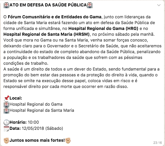 Enquanto conselheiros envolvidos ‘jogam a bomba’ a quem é de direito, o secretário de saúde, e esse por sua vez, gera mais um prejuízo financeiro ao erário público e social à população, populares de Santa Maria e do Gama devem abraçar o HRSM e o HRG, na manhã deste sábado, às 10 horas, paralelamente.