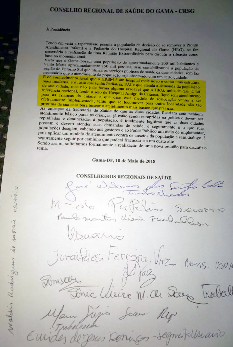Ao menos oito conselheiros assinaram um documento em que solicitam uma reunião extraordinária para discutir a reabertura do Pronto Atendimento Infantil (PAI) e da pediatria do HRG. Nele, representantes de usuários e trabalhadores do CRSG reconhecem que o HRSM é uma unidade mais moderna e nova, porém, mas que o Gama, com cerca de 200 mil habitantes, 50 mil a mais que Santa Maria, deve oferecer atendimento ambulatorial e de urgência às crianças da cidade e, também, do entorno.