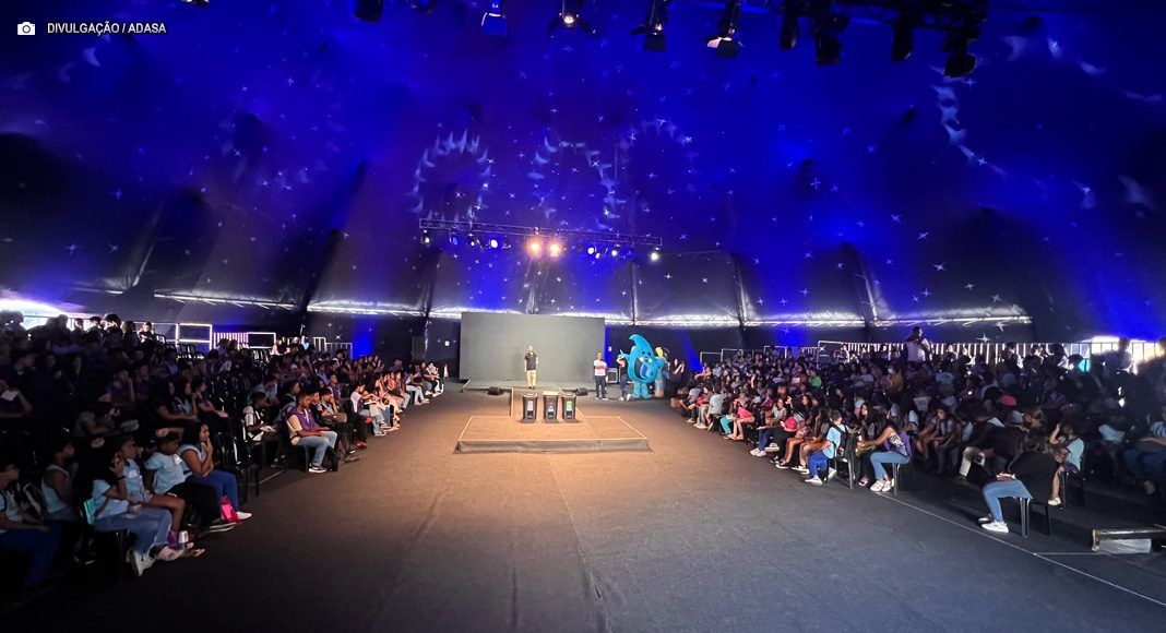 Cerca de 500 crianças de escolas públicas do Distrito Federal participaram, nesta quinta-feira (12), de uma aula espetáculo promovida pelo programa Adasa na Escola, na tenda geodésica da 38ª Feira do Livro de Brasília. A apresentação abordou de forma lúdica o uso racional da água e o descarte correto dos resíduos sólidos, com contação de histórias, músicas, mascotes e atividades pedagógicas que prenderam a atenção do público infantil.