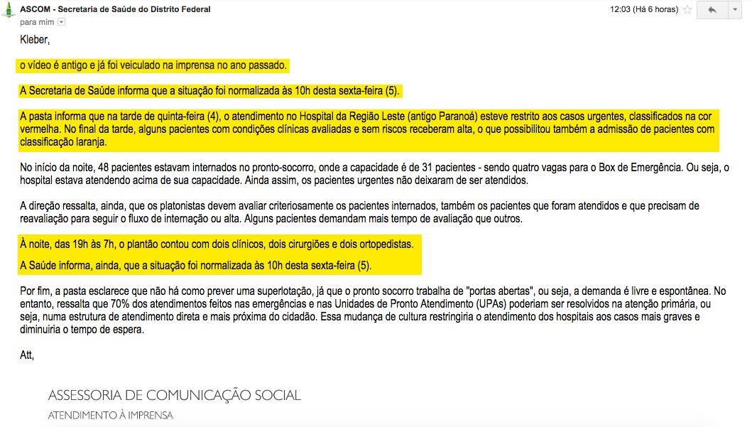 Questionada sobre o assunto, a SES-DF, estranhamente, alegou se tratar de um vídeo “antigo e já foi veiculado na imprensa no ano passado”, porém, chama atenção, ainda no parecer da Secretaria pois ela também afirma que “a situação foi normalizada às 10h desta sexta-feira (5). Afirmações essas que sugerem que, se houve suspensão de atendimento ainda em 2017, que até a presente data, os atendimentos, de fato estavam paralisados.