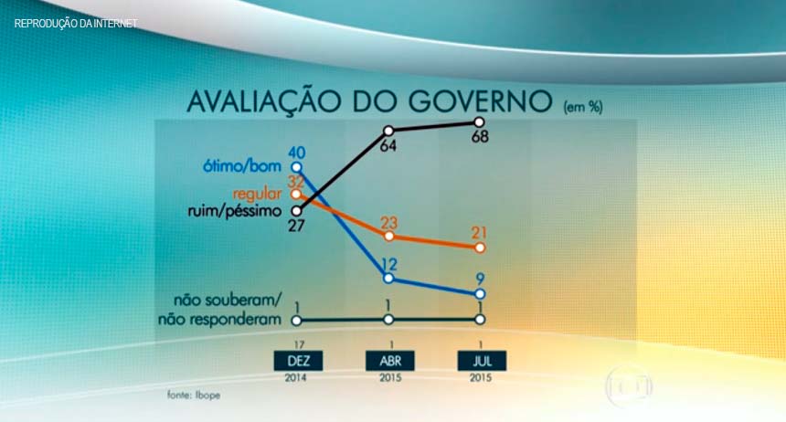 A atual rejeição ao governo Dilma (68%) é a maior já registrada pela série histórica das pesquisas Ibope desde a redemocratização, informou o instituto.