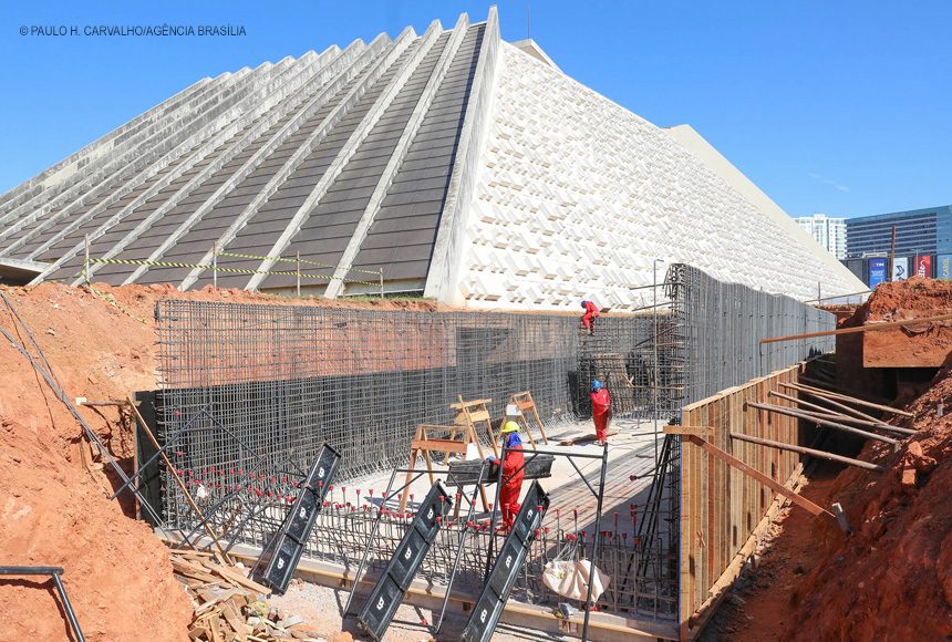 “No ambiente externo, teremos esse reservatório com água em seu interior, que já está bem adiantada a construção. É um mecanismo anti-incêndio”, revela a fiscal da obra pela Novacap, Uyara Mendes. “E também estamos trabalhando na escavação do espaço que vai abrigar dois geradores de energia para atender a Sala Martins Pena”, diz.