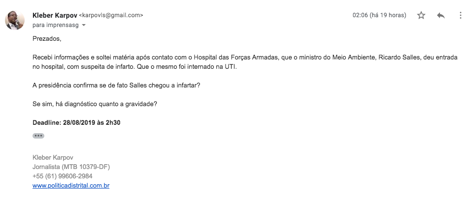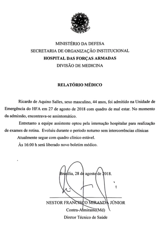 Caso esse, classificado posteriormente pelo ministro da Defesa, Fernando Azevedo e Silva, de ” estresse… vamos dizer… ambiental”, ao anunciar que Salles deveria receber alta ainda na tarde desta quarta-feira e, negar se tratar de princípio de infarto.