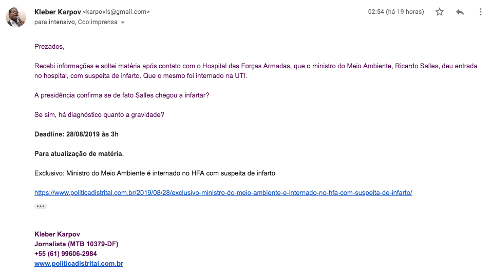 Na tarde desta quarta-feira (28/Ago), o ministro do Meio Ambiente, Ricardo Aquino Salles, recebeu alta, após internação, no início da madrugada do dia anterior, no Hospital das Forças Armadas (HFA).