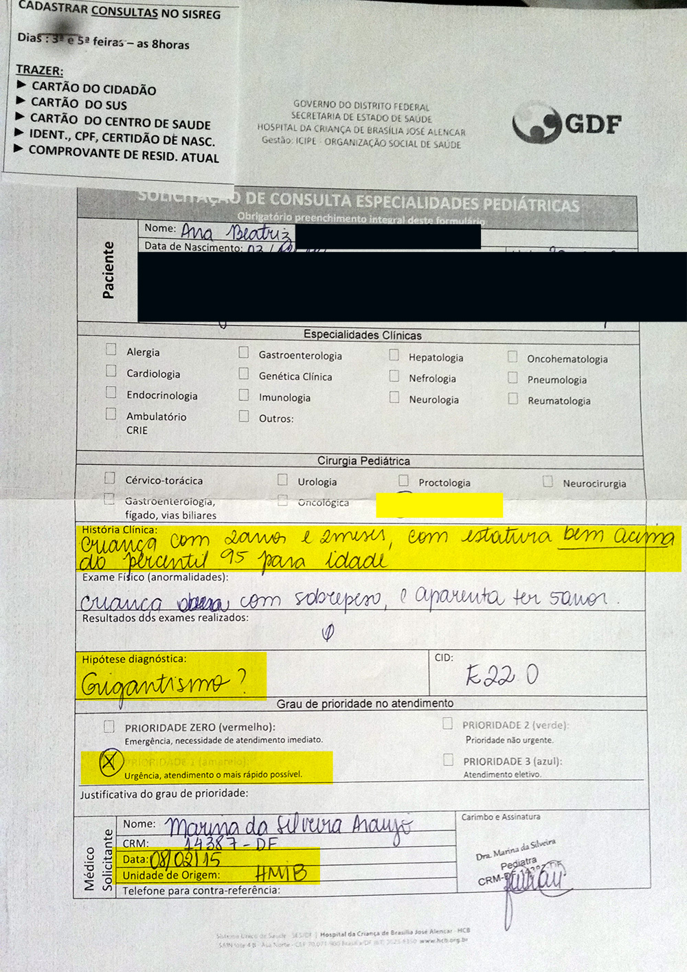 O outro caso, da pequena Ana Beatriz, então com três anos e meio, filha de Ana Paula, moradora de Riacho Fundo I. Com dois pedidos de exames para o HCB, de unidades diferentes, e um ano e meio de espera, a criança não conseguiu atendimento de um endocrinologista.