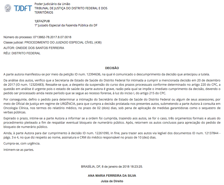 Em 19 de dezembro de 2017, a magistrada estabeleceu o prazo de cinco dias para a SES-DF marcar consulta oncológica para a paciente. Porém, após descumprir a decisão, Oneide recorreu, novamente ao TJDFT, em que a juíza voltou a conceder 48 horas para atender a determinação judicial, sob pena de sequestro de verbas públicas para custeio do tratamento.