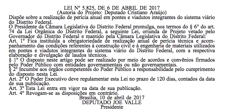Mas, para reforçar a ausência de ação do Estado, anunciadas por SINDUSCON, CREA-DF e TCDF, em 2017, o blog DF em Foco (Veja Aqui) apontou que Rollemberg chegou a vetar o Projeto de Lei (PL) 271/2015, de autoria do deputado distrital, Cristiano Araujo (PSD) que obrigava o GDF a realização de perícias técnicas em todas as pontes e viadutos do DF integrantes do sistema viário do DF. No entanto, em abril do ano passado, a Câmara Legislativa do DF (CLDF) derrubou o veto do chefe do Executivo, que deu origem a Lei 5.825/2016.