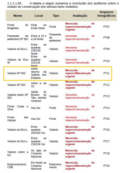 Nesta terça, foi a vez do TCDF publicitou o relatório de uma Auditoria do Tribunal de Contas do DF sobre a Conservação e Manutenção de Bens Públicos, concluída em julho de 2012. O Tribunal avaliou três pontos da DF 002 (Processo 5687/2011) e o viaduto que desabou nessa manhã estava entre eles.