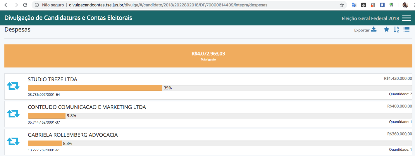 O outro caso, considerado legal, também chama atenção, se considerado a ótica do interesse em dinheiro para da advogada do Partido Socialista Brasileiro (PSB) no DF. O escritório Gabriela Rollemberg Advocacia (GRA), da filha do chefe do Executivo, levou na disputada de primeiro turno, nada menos que R$ 360 mil com o escritório de advocacia, apenas para defender o candidato ao GDF, por acaso pai da operadora do direito. Recurso esse do PSB, originário do Fundo Partidário Eleitoral.