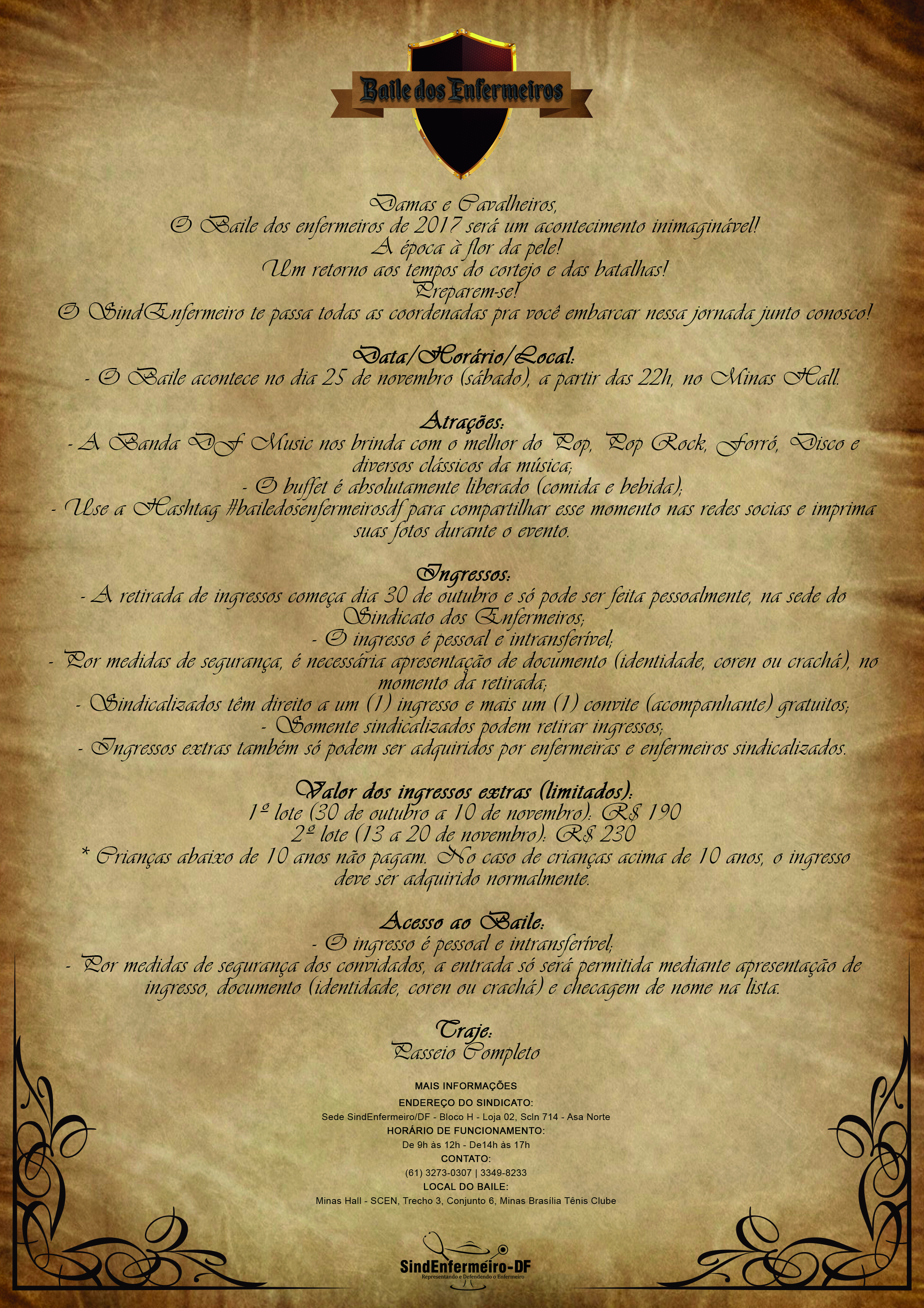 O Sindicato dos Enfermeiros do DF (SINDENFERMEIRO-DF) realiza, na noite de sábado (25/Nov), à partir das 22 horas, mais uma edição do Baile dos Enfermeiros. Nessa edição os profissionais de enfermagem contam com a animação da banda DF Music no Salão Minas Hall, do Minas Brasília Tênis Clube.