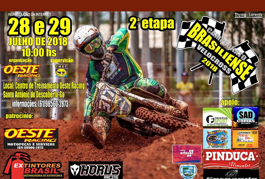 A galera que curte esporte radical, tem agenda cheia para este final de semana. Na manhã de sábado e domingo, 27 e 28 de julho, acontece, no Centro de Treinamento Oeste Racing de Santo Antônio do Descoberto (GO), cidade há cerca de 40 quilômetros de Brasília, a 2a Etapa do Campeonato Brasiliense de Velocross 2018.