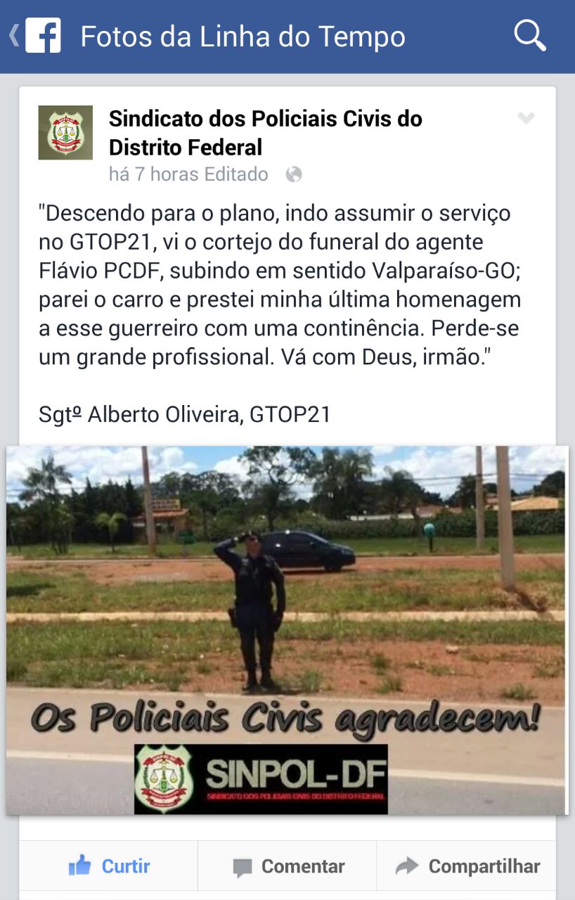 O reflexo disso é foi assistir uma postagem nas redes sociais em que um sargento da PM, ao ver o cortejo do corpo de Flavio, seguindo para enterro na cidade de Valparaiso (GO), estacionou o carro e prestou continência em um ato solitário e solidário, que demonstra não só o respeito que entre os companheiros da segurança, por saberem dos perigos que os policiais estão expostos e que se refletem muito mais na população civil.