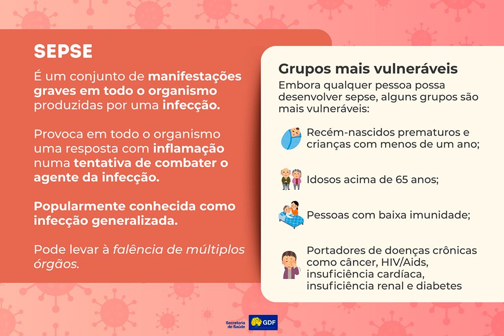 Secretaria de Saúde do DF (SES-DF) adota, nesta semana do Dia Mundial da Sepse, protocolos especiais para combater a alta mortalidade da doença, popularmente conhecida como ‘infecção generalizada’. A iniciativa busca ampliar o diagnóstico precoce e o tratamento eficaz, como em capacitação para pediatras no Hospital Materno Infantil de Brasília (Hmib), agendada para quinta-feira (11/Set), para reverter um quadro que leva a óbito até 60% dos pacientes no Brasil.
