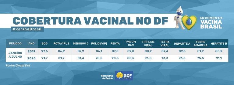 O Ministério da Saúde preconiza em 90% a cobertura para as vacinas BCG e contra o Rotavírus e 95% para as demais vacinas indicadas na rotina do calendário nacional de vacinação. No primeiro semestre, embora várias vacinas não tenham atingido a meta, a pentavalente (que protege contra a meningite, difteria, tétano, coqueluche e hepatite B) e a que previne a hepatite B ultrapassaram o percentual alcançado no mesmo período de 2019.