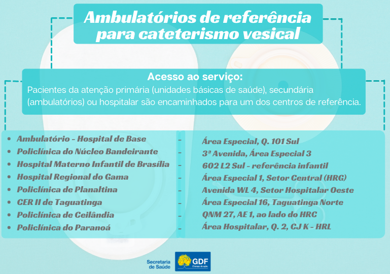 Para o atendimento aos pacientes com as complicações relacionadas ao cateterismo vesical intermitente, a rede de saúde conta com oito ambulatórios de referência. Confira, na arte abaixo, os locais.