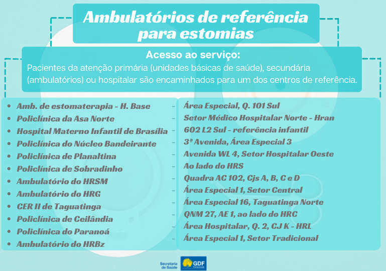 Também foi iniciado o atendimento aos pacientes com estomias alimentares (gastrostomia, jejunostomia) no ambulatório de estomias do Centro Especializado em Reabilitação (CER) de Taguatinga. Todos profissionais de saúde que se atenderem algum paciente com os critérios descritos acima devem encaminhá-los aos ambulatórios de enfermagem referência de cada região de saúde.