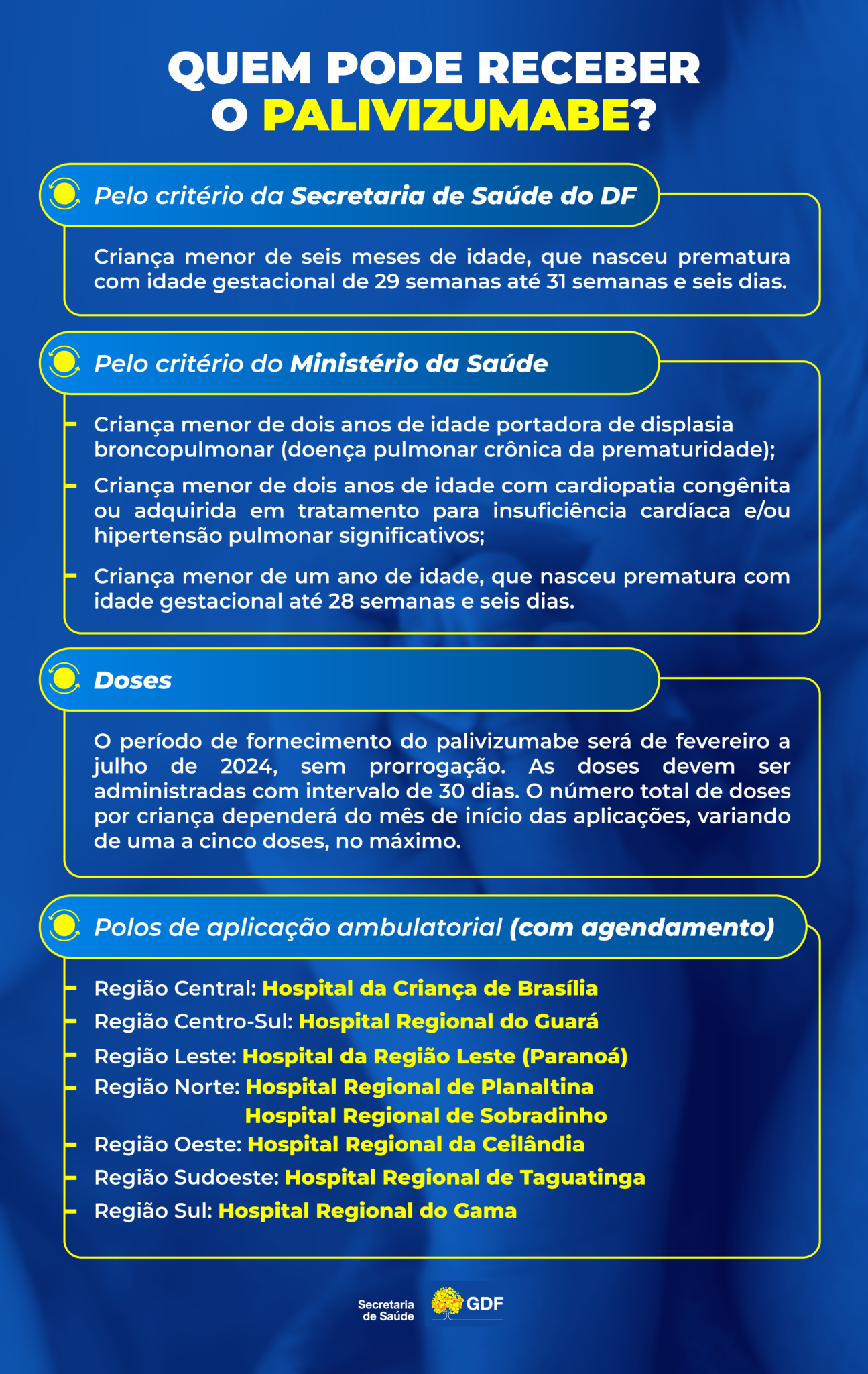 Os pacientes internados na rede pública de saúde que atendam aos critérios estabelecidos recebem a medicação durante a assistência hospitalar, por prescrição médica. Os pacientes externos e internados na rede privada podem ter acesso ao palivizumabe, se corresponderem aos critérios do MS, por autorização emitida pelo Hospital da Criança de Brasília ou médico pneumologista autorizado pela SES-DF para os casos de pneumopatias; e, para os casos de cardiopatia, mediante autorização pelo Hospital da Criança, pelo Instituto de Cardiologia e Transplantes do Distrito Federal (ICTDF) ou por cardiologista pediátrico autorizado pela SES-DF.
