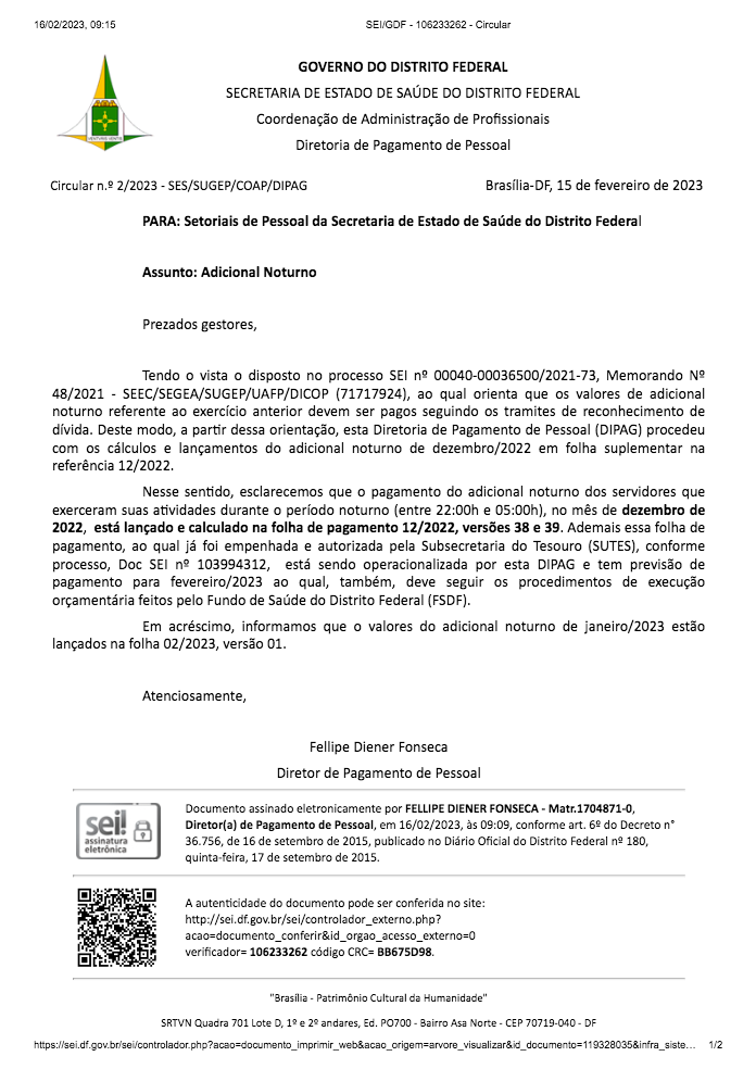 A Secretaria de Saúde (SES) publicou uma circular informando sobre o pagamento do adicional noturno de dezembro de 2022.