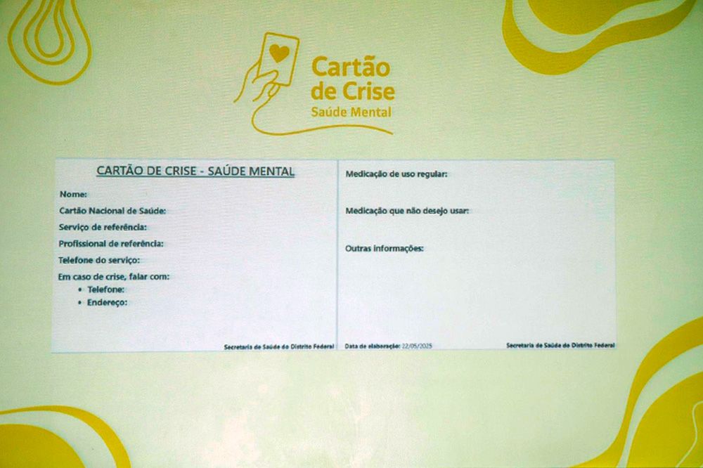 A subsecretária de Saúde Mental da SES-DF, Fernanda Falcomer, ressalta que, com o apoio do cartão, o paciente, quando em crise, pode comunicar, a quem lhe der assistência, suas especificidades e preferências. “O cartão de crise é uma estratégia de cuidado que amplia a autonomia do paciente, fazendo com que ele comunique à equipe assistencial a melhor forma de acolhê-lo durante uma crise psíquica. A ação representa mais um passo no fortalecimento da Rede de Atenção Psicossocial do DF, promovendo cuidado humanizado e maior segurança nos atendimentos emergenciais”, destacou durante a reunião da Rede de Atenção Psicossocial, ocorrida na sexta-feira (23), no auditório do Hemocentro.