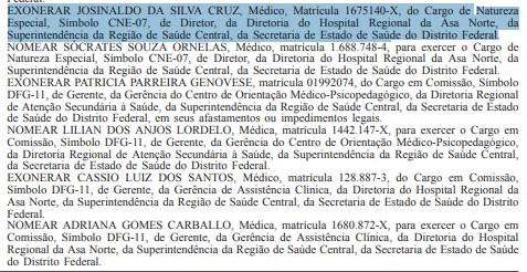 No mesmo mês, a exoneração do gestor do Hospital Regional de Santa Maria, Igor Silveira Dourado, foi publicada no Diário Oficial do DF.