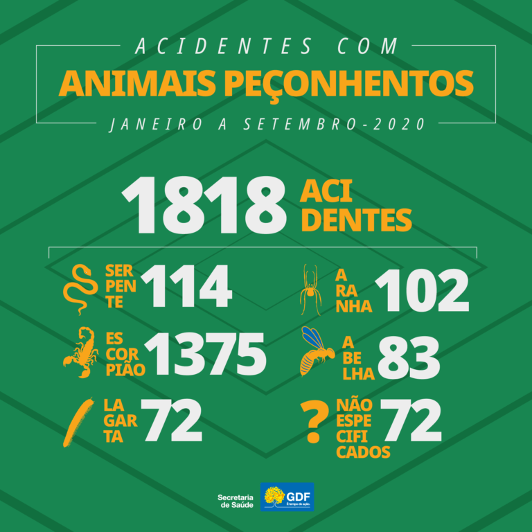 Os acidentes com animais peçonhentos são mais frequentes do que se imagina. No entanto, há maneiras de preveni-los e, caso ocorram, a rede pública de saúde do DF está preparada para prestar atendimento. De janeiro a setembro de 2020, a Vigilância Epidemiológica registrou 1.818 acidentes com animais peçonhentos. O animal com maior número de ocorrências é o escorpião, que resultou em 1.375 acidentes.