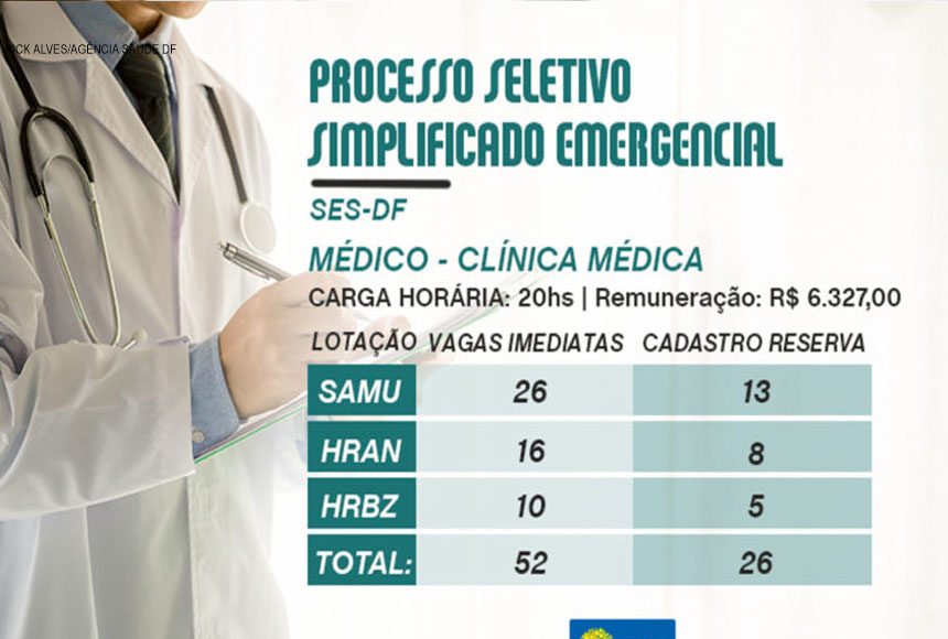 As inscrições para o processo seletivo abrem na próxima segunda-feira (7) e vão até o dia 22 de dezembro. Os aprovados irão trabalhar no Serviço de Atendimento Móvel de Urgência (Samu), nos hospitais regionais da Asa Norte, Planaltina e Brazlândia e no Hospital de Campanha de Ceilândia – os médicos deste processo seletivo que atuarão nesta unidade serão lotados no HRC.