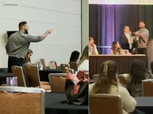 “Esse filho da puta abusou sexualmente da minha esposa sete anos atrás, seja homem!”, disse a platéia em palestra proferida em um painel do encontro anual do Colégio Americano de Obstetras e Ginecologistas (ACOG, na sigla em inglês). “Sete anos que eu espero por isso, sete anos que minha esposa sofre porque você é um maldito predador”, disse ao apontar para a mulher e enfatizar o sofrimento da esposa.