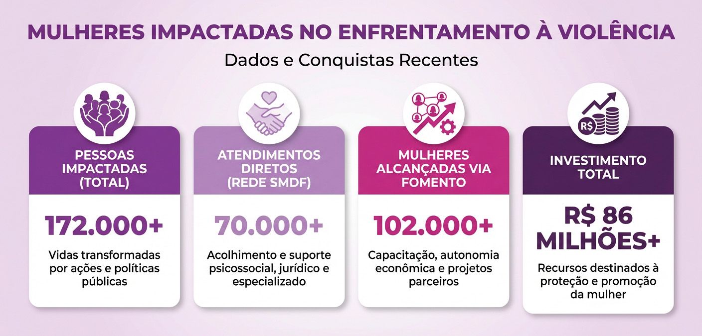 A Secretaria da Mulher (SMDF) encerrou o balanço de 2025 com o registro de 172 mil pessoas impactadas por ações de enfrentamento à violência e fortalecimento de políticas públicas. Os dados indicam a realização de 70 mil atendimentos diretos na rede própria, além de 102 mil mulheres alcançadas via termos de fomento. A gestão financeira da pasta atingiu execução orçamentária superior a 90%, com a aplicação de recursos que somam R$ 86 milhões no decorrer do ano.