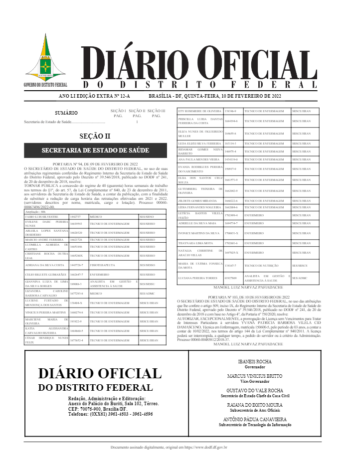 A Secretaria de Saúde do Distrito Federal (SES-DF) publicou na última quinta-feira (10/02) no Diário Oficial do Distrito Federal (DODF) a lista com os nomes de 33 servidores que terão a carga horária ampliada de 20 para 40 horas semanais.