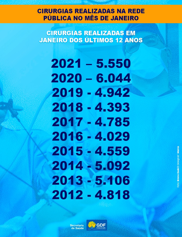 Mesmo atravessando a pandemia do novo coronavírus Sars-CoV-2 há mais de um ano, a Secretaria de Saúde fechou o mês de janeiro de 2021 atingindo a segunda maior marca de cirurgias realizadas nos últimos 12 anos (veja quadro abaixo). Foram 5.550 cirurgias em janeiro contra 6.044 em 2020, antes da pandemia, quando a melhor marca, até então, foi alcançada .