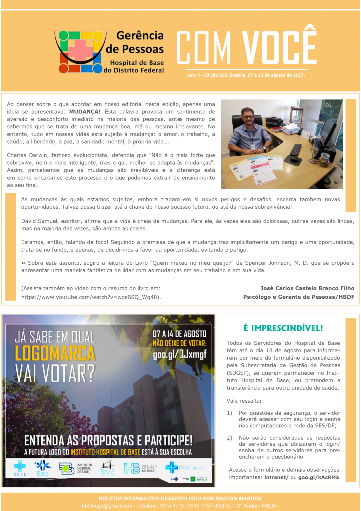 No Boletim Informativo, Gerência de Pessoas Com Você de 7 a 13 de agosto, a gestão sugere ser “imprescindível” que “Todos” os servidores do HBDF informem, até o dia 18 de agosto, se querem permanecer no IHBDF ou “pretendem a transferência para outra unidade de saúde.”.