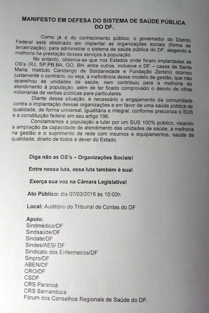 Contrários à instituição das OSs, o Movimento em Defesa do Sistema Público de Saúde do Distrito Federal, composto por representantes de entidades sindicais; usuários do Sistema Único de Saúde (SUS), vinculados aos conselhos regionais de Saúde do DF; servidores; concursados que aguardam nomeação; além de outras carreiras e conselhos profissionais que devem participar da realização de Ato Público na segunda-feira (7/Mar). Na ocasião os manifestantes devem lançar um Manifesto em Defesa do Sistema Público de Saúde do Distrito Federal, no auditório do Sindicato dos Médicos do DF.