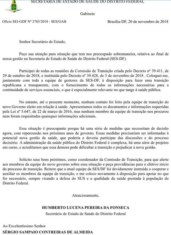 No documento, Fonseca aponta que, embora tenha encaminhado as documentações previstas em decreto, até o momento, a equipe de transição do governador eleito, Ibaneis Rocha (MDB), fez contato com o atual Secretário para tratar de temas da Pasta.