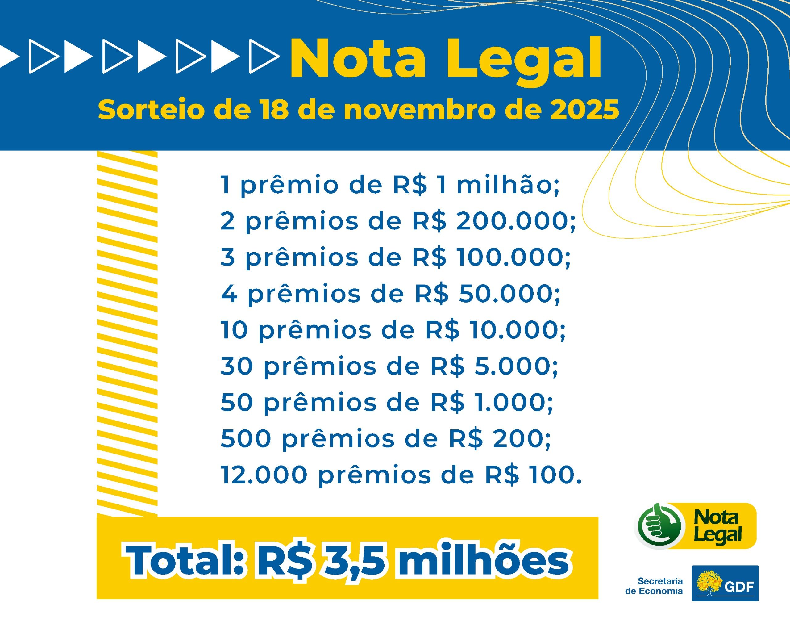 Atenção, consumidores: o segundo sorteio de 2025 do Nota Legal já tem data marcada. Em 18 de novembro serão sorteados R$ 3,5 milhões, num total 12,6 mil bilhetes – com o principal de R$ 1 milhão (livre de impostos). As normas para a operacionalização foram publicadas pela Secretaria de Economia (Seec-DF) na Instrução Normativa nº 17 do Diário Oficial do Distrito Federal (DODF) nesta terça-feira (22).