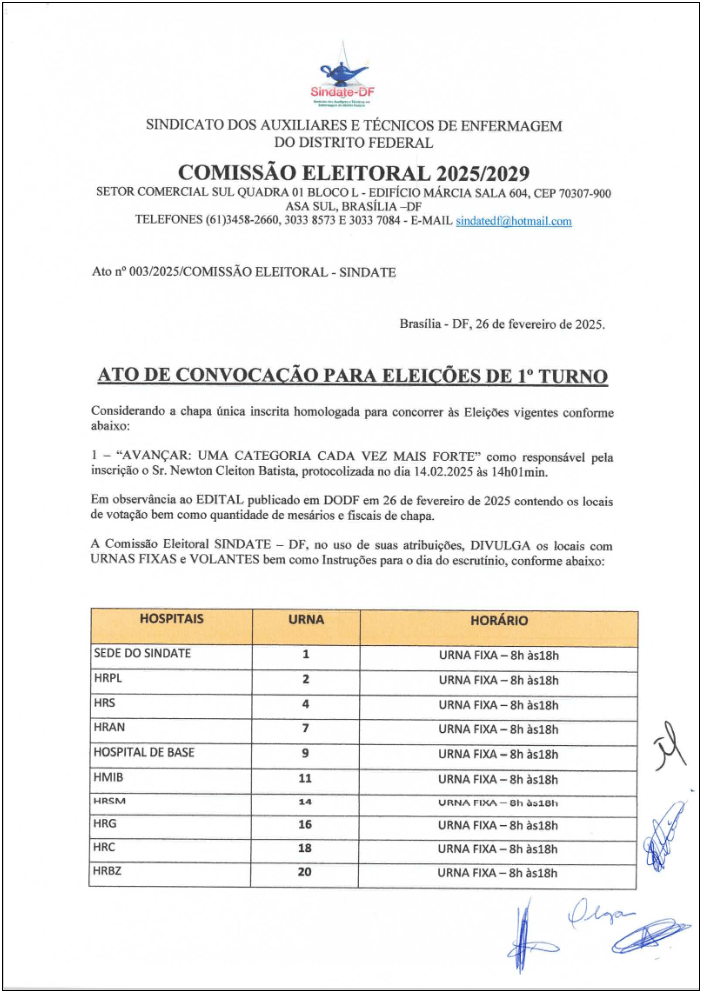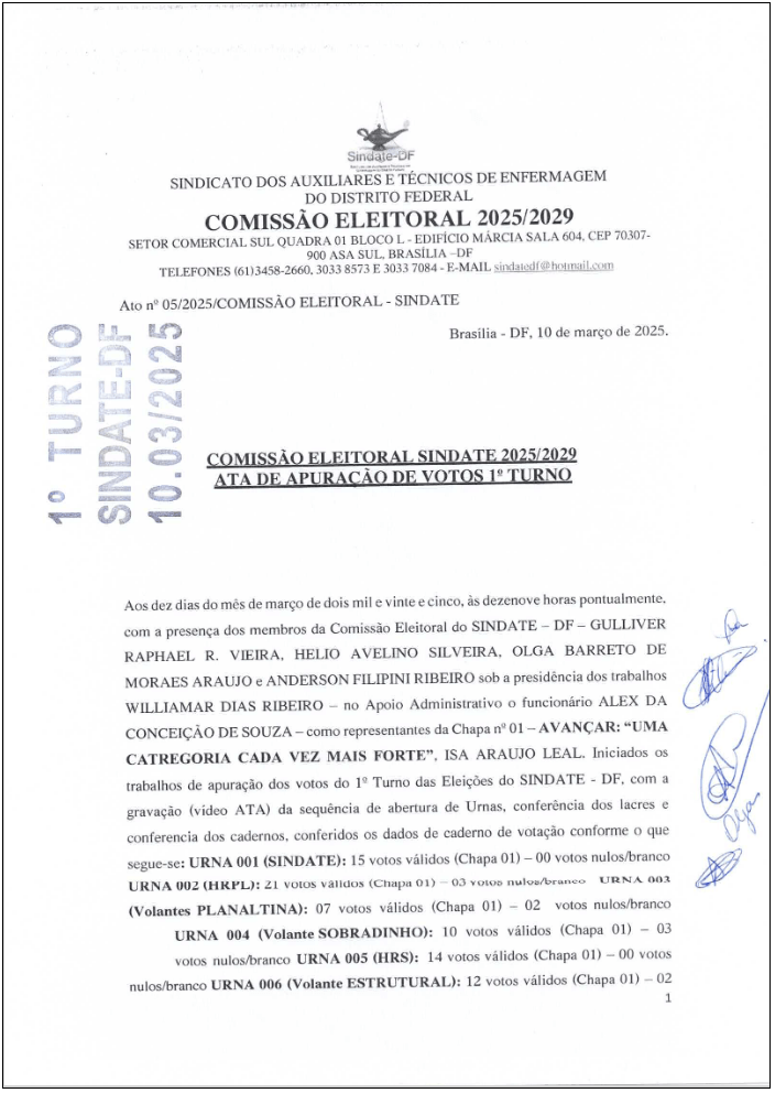 A direção do Sindicato dos Auxiliares e Técnicos em Enfermagem do DF (Sindate-DF), deve realizar, nesta quinta-feira (13/Mar), o segundo turno da eleição da diretoria para a próxima gestão referente ao pleito 2025/2029.