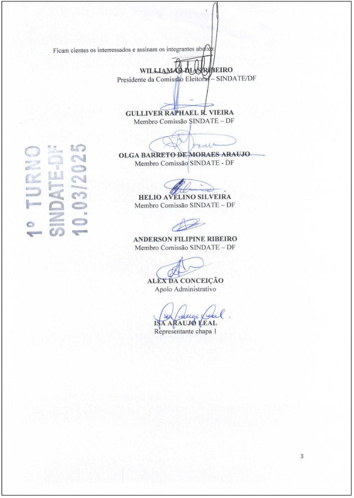 Disputado em chapa única, de acordo com divulgação por parte da Comissão Eleitoral do pleito 2025/2029 do Sindate-DF, apuração do primeiro torno, realizada na segunda-feira (10/Mar), a Chapa 1 recebeu um total de 392 votos equivalente a 92% dos 422 votos válidos totalizados na eleição, 8% dos eleitores votaram em branco, com a soma de 30 votos.