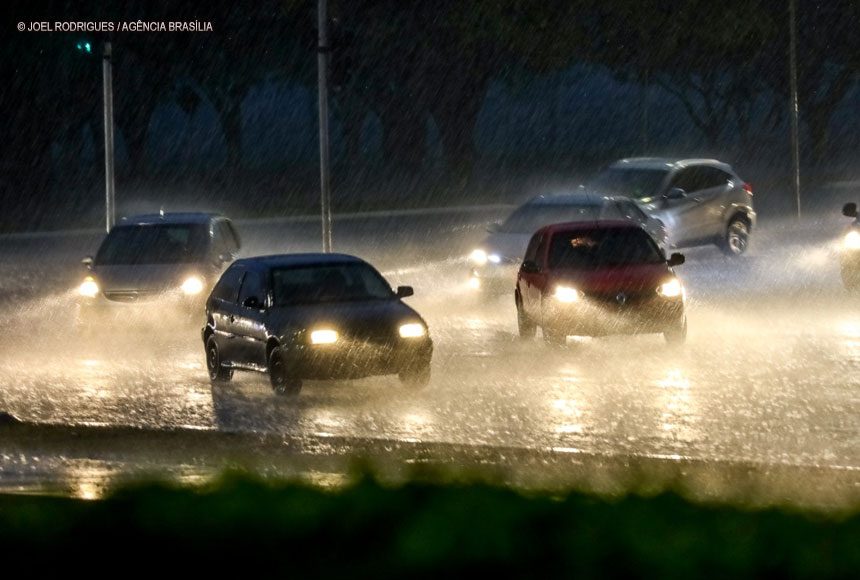 Ao ser pego por uma chuva torrencial, mantenha a calma e dirija com cautela. O ideal é procurar um local seguro para estacionar, longe de árvores e alambrados metálicos, para aguardar que a tempestade cesse. “O motorista não pode se arriscar e nem achar que o veículo tem condições de passar pelo alagamento”, pontua o porta-voz do Detran, Gláubio Peixoto.