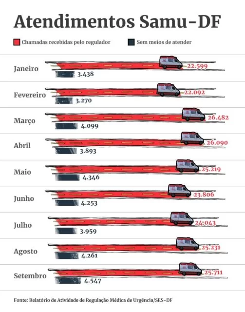 Há um mês, o Metrópoles mostrou que nenhuma ambulância do Samu-DF conta com o suporte de um médico, e que os próprios profissionais da área se preocupam com a situação (leia mais abaixo). Segundo o relatório, entre janeiro e setembro deste ano, o Samu não conseguiu atender 36.066 chamadas que foram classificadas como reais — ou seja, não eram trotes e, de fato, precisavam de suporte médico.