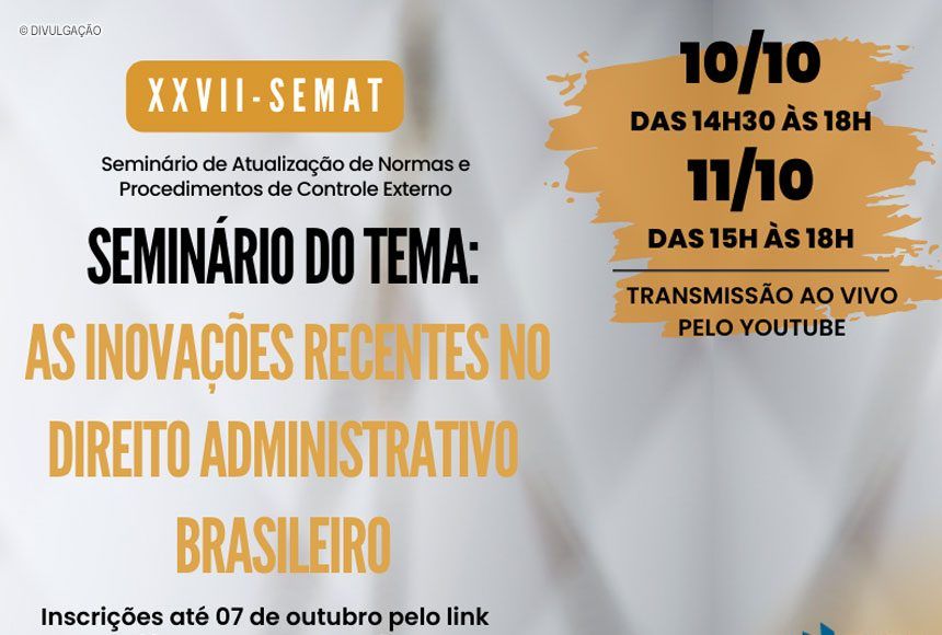Estão abertas as inscrições para a 27ª edição do Seminário de Atualização de Normas e Procedimentos de Controle Externo (SEMAT) do Tribunal de Contas do Distrito Federal. O evento de capacitação para servidores dos órgãos e entidades do DF vai abordar as inovações recentes no Direito Administrativo Brasileiro, como, por exemplo a Nova Lei de Licitações; a Nova Lei de Improbidade Administrativa; e os impactos da implementação da Lei Geral de Proteção de Dados (LGPD)