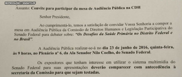 O presidente da Comissão de Direitos Humanos e Legislação (CDH), o senador Paulo Paim (PT), convida o vice-presidente do Sindate-DF, Jorge Vianna para compor a mesa da Audiência Pública, que será realizada na quinta-feira (23) às 9 horas no Senado Federal e tem como tema de debate: “ Os desafios da Saúde Primária no Distrito Federal e no Brasil”.