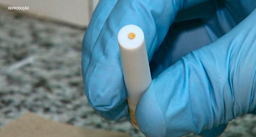 O sensor é formado por um bastão com um condutor elétrico e um disco de ouro de 2 mm na ponta. Uma amostra de sangue ou saliva é colocada em contato com o eletrodo e, se as partes não se juntarem naquele desenho clássico do DNA, a dupla hélice, significa que a pessoa não tem a mutação, não tem o defeito genético. Mas, se os fragmentos se juntarem, existe a tendência a desenvolver a doença.