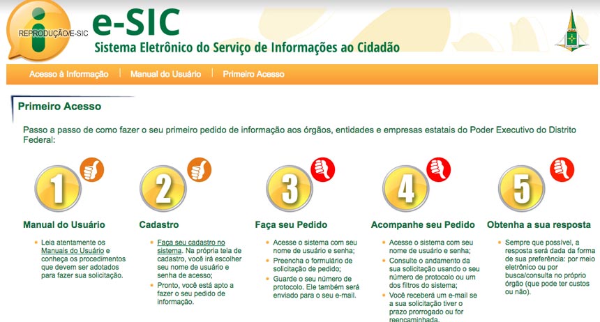 Os cidadãos do Distrito Federal que quiserem solicitar informações ao Governo do Distrito Federal, podem enfrentar dificuldades. O Serviço Eletrônico do Serviço de Informações ao Cidadão (E-SIC) do DF, embora o sistema permita aos usuários, se cadastrarem e informarem a demanda, não submete a demanda.