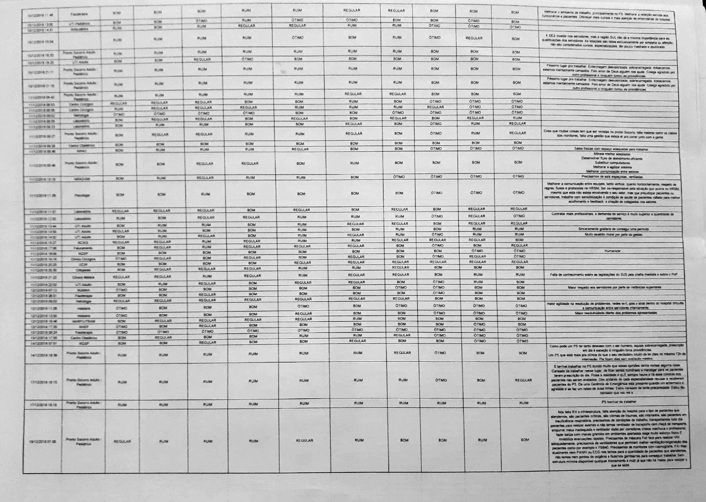 PD teve acesso a cópia de um relatório de avaliação dos servidores do HRSM que apontam, em grande maioria, o desapontamento dos profissionais de saúde. Mas, tais manifestações ultrapassam as fronteiras das avaliações e chegam, também, nas redes sociais.