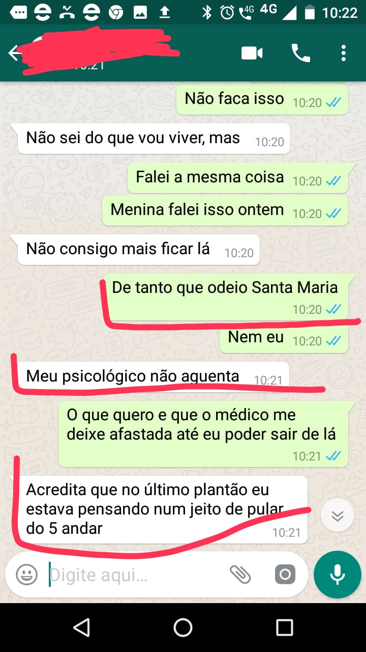 Um desses casos veio a público nessa semana, encaminhado ao PD, por dois servidores do HRSM. Em uma troca de mensagem que circulou no aplicativo Whatsapp, uma profissional de saúde da unidade, manifestou pensamento de autoextermínio, em decorrência do clima para se trabalhar naquela unidade. “Acredita que no último plantão eu estava pensando num jeito de pular do 5 andar.”, diz após observar a falta de capacidade psicológica de continuar no hospital.